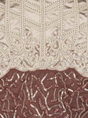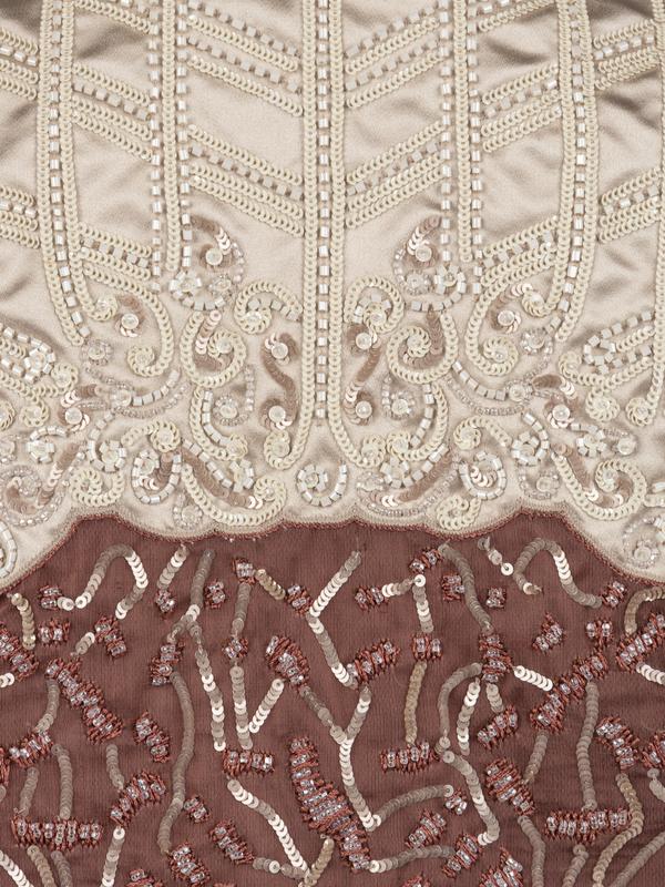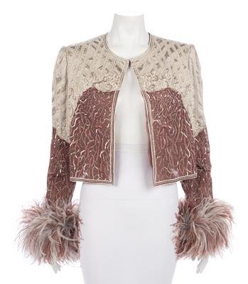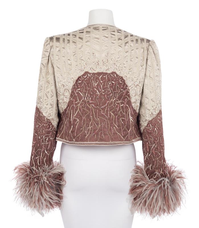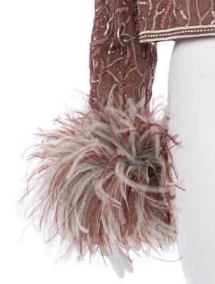 Taupe silk satin and mauve silk organza crop jacket heavily embellished with sequins and beads, and trimmed with ostrich feathers at sleeve hems.