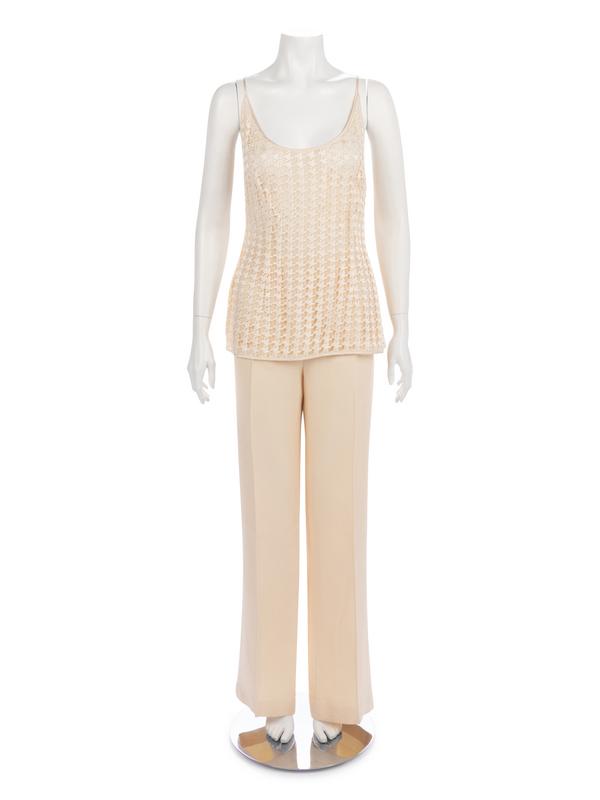 Cream rayon/silk/wool blend textured suit jacket paired with matching flared pants and cream rayon/cotton blend shell top with houndstooth pattern overlay.