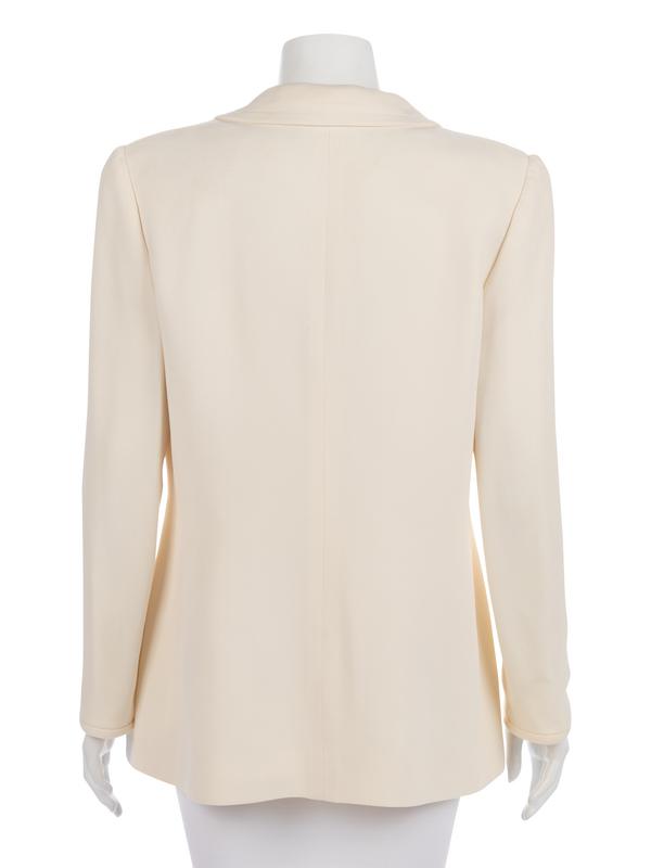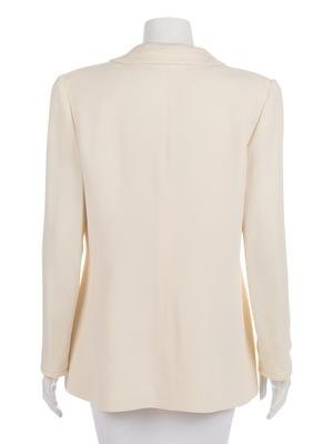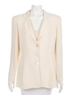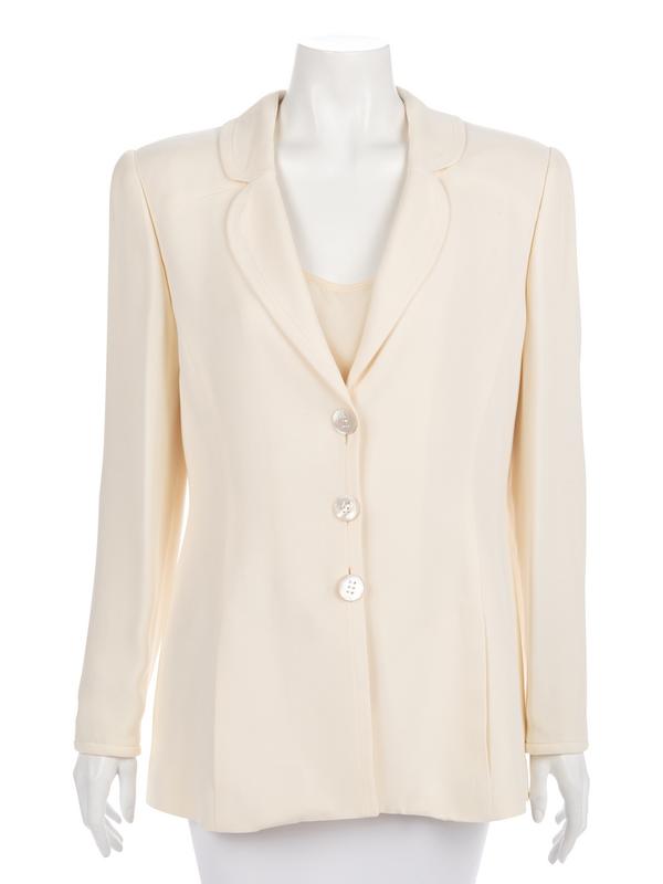 Cream acetate/rayon blend crepe suit jacket with inseam front pockets, shell and rhinestone buttons, and paired with cream silk tank shell top.