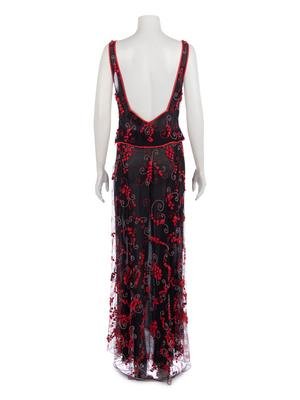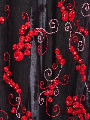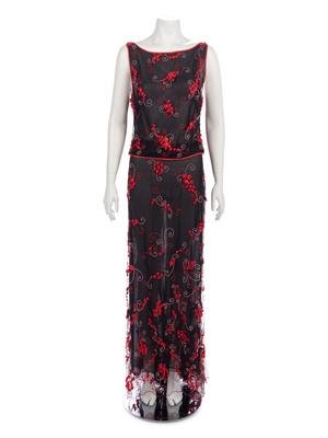 Black net and crepe two pieces skirt ensemble with a tank style top that has red and pink beaded and grosgrain ribbon floral embellishments and matching skirt.