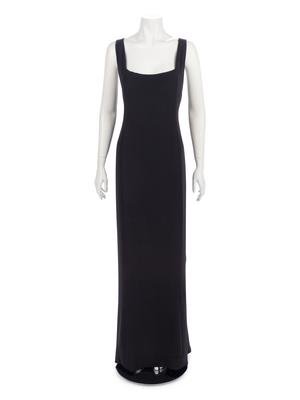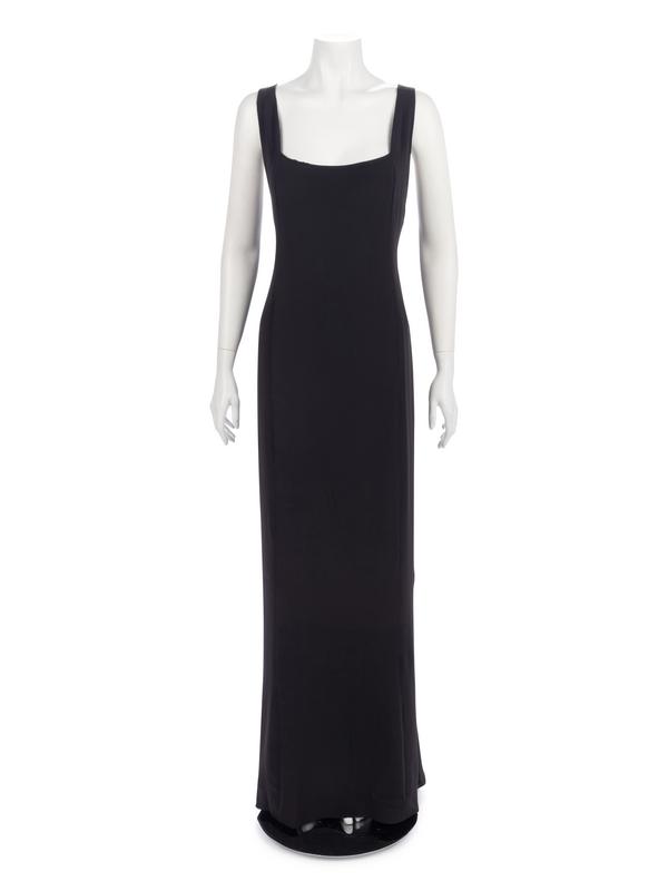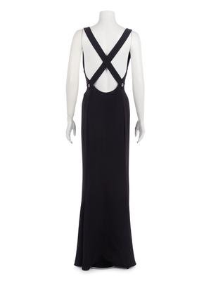Black acetate/silk blend crepe cross-back strap evening dress with square black and silver rhinestone detail on back straps.