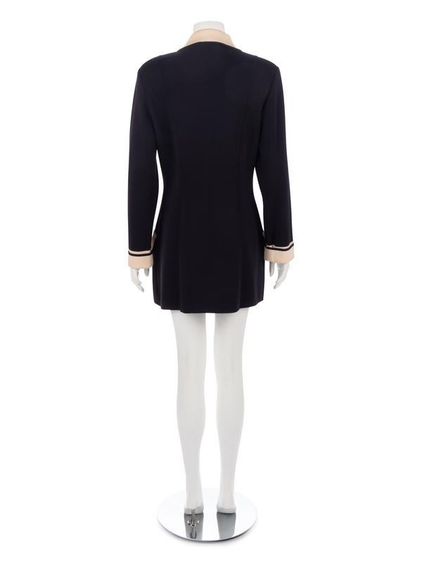 Black and cream wool knit jacket with rounded lapel, cuffed sleeves, front hip flap pockets, and center front button closure.