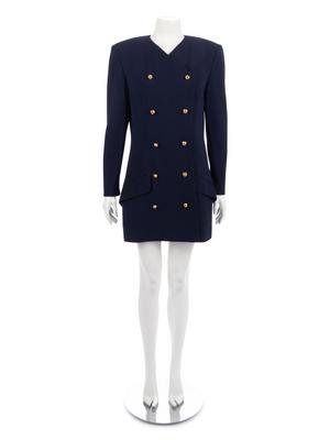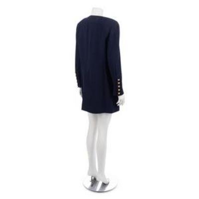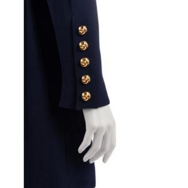 Dark blue wool crepe double breast jacket with clean neckline, front hip flap pockets, and gold-tone metal knot button closure.