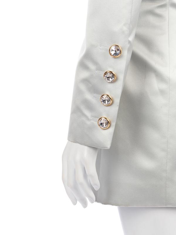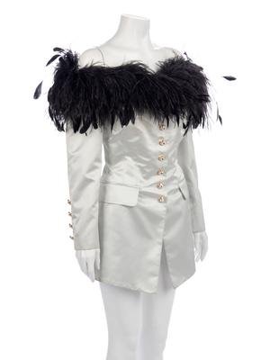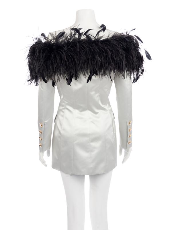 Light blue silk/polyester blend satin off the shoulder evening jacket trimmed in black ostrich and coque feathers and center front, gold-tone metal and glass crystal cut stone button closure.
