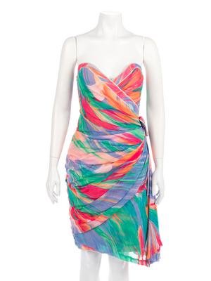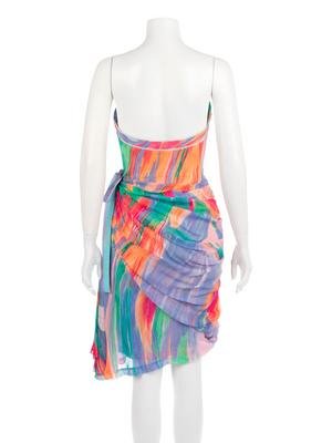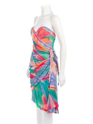 Multi-hued brushstroke printed silk strapless dress with draped front bodice and skirt gathered to the left side and detailed with a bow.