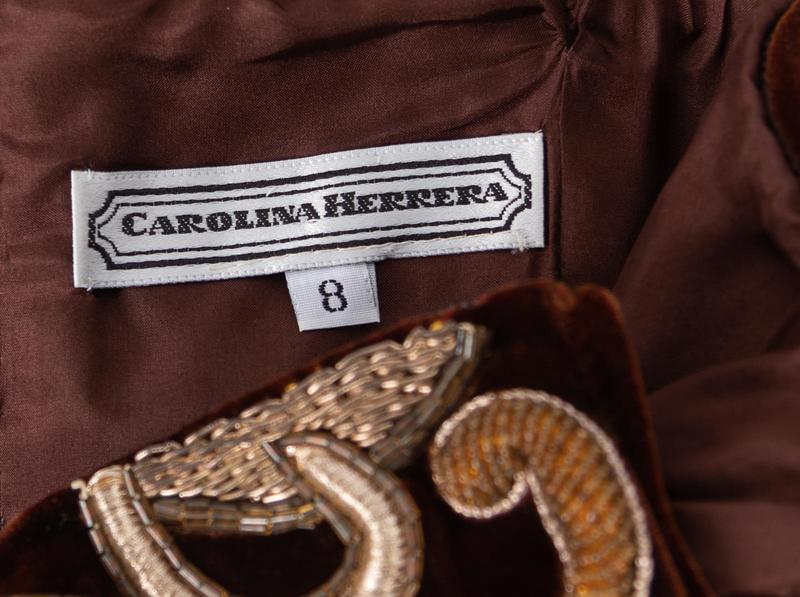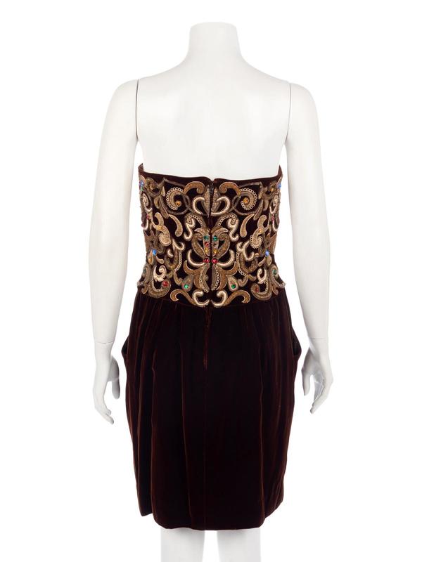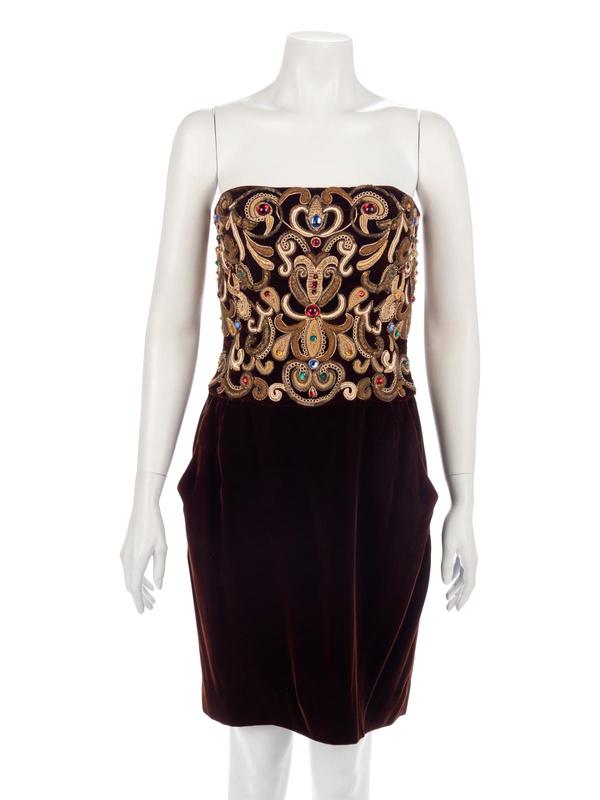 Brown velvet strapless evening dress heavily embellished with metallic thread, beading, and rhinestones.