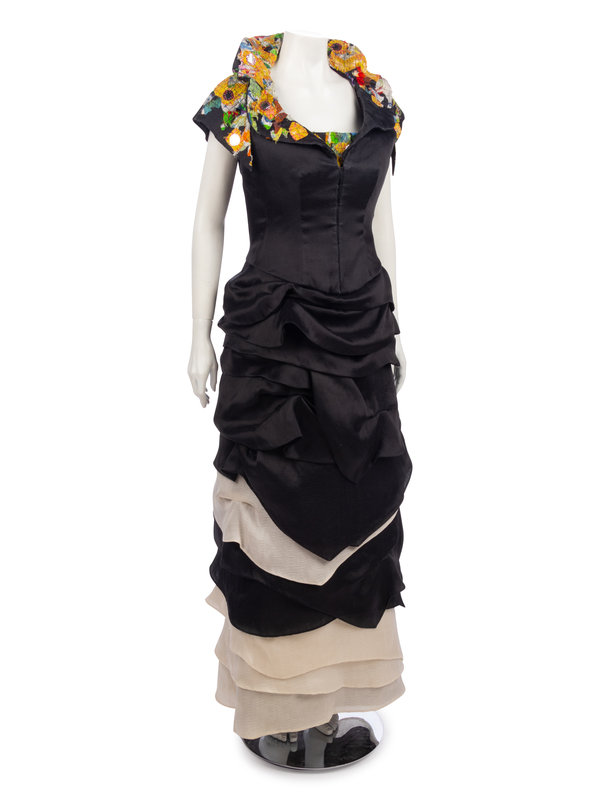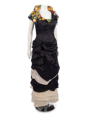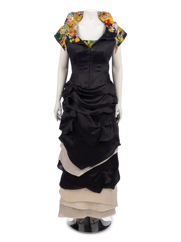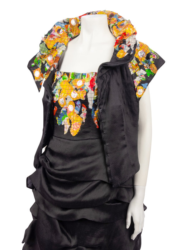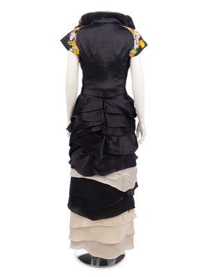 Black striped silk/cotton blend strapless tiered evening dress with multicolored and patterned applique patchwork at the neckline; paired with matching cap sleeve jacket with wired collar.