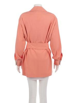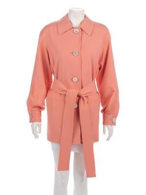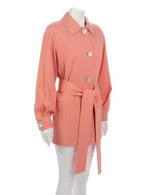 Peach rayon twill weave belted jacket trimmed in white scored calf leather under collar and inner cuffs and shell buttons.