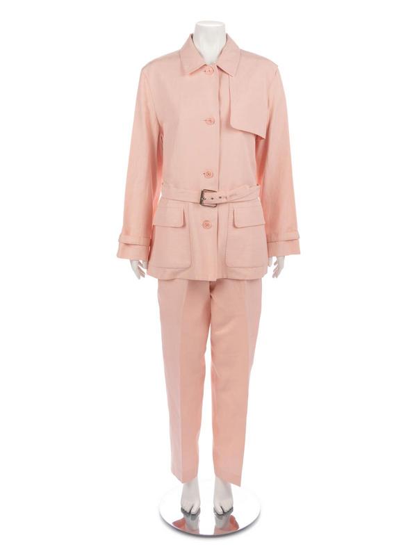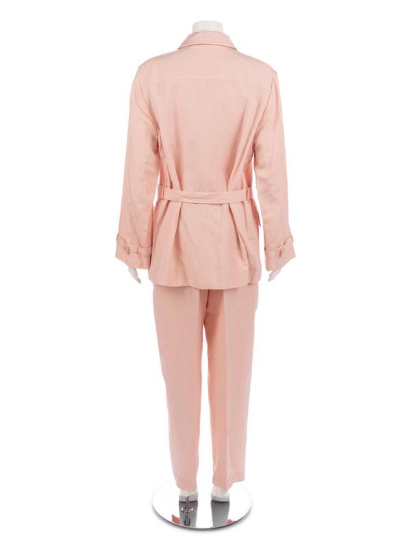 Pink silk/linen blend belted jacket with large roll collar, front patch pockets, center front button closure with belt and paired with matching pink silk/linen blend wide leg straight fit pants.