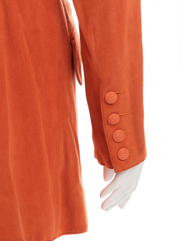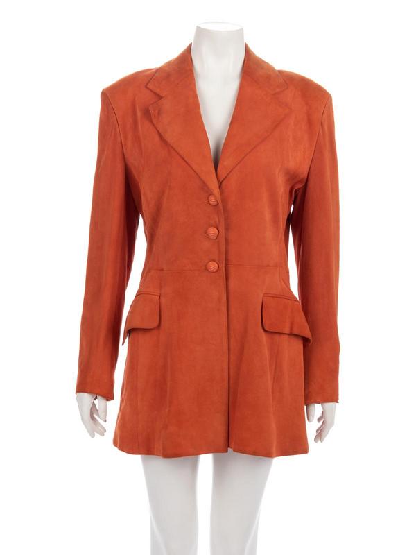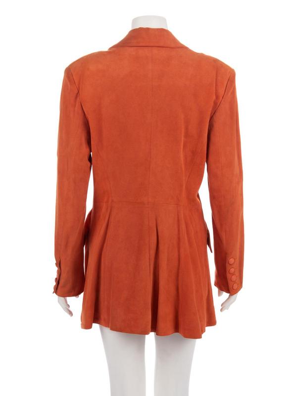 Orange suede jacket with wide notch lapel, flared hemline, and center front button closure.