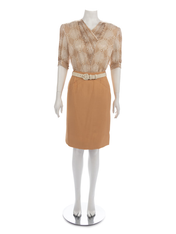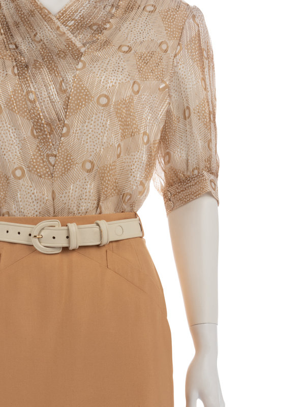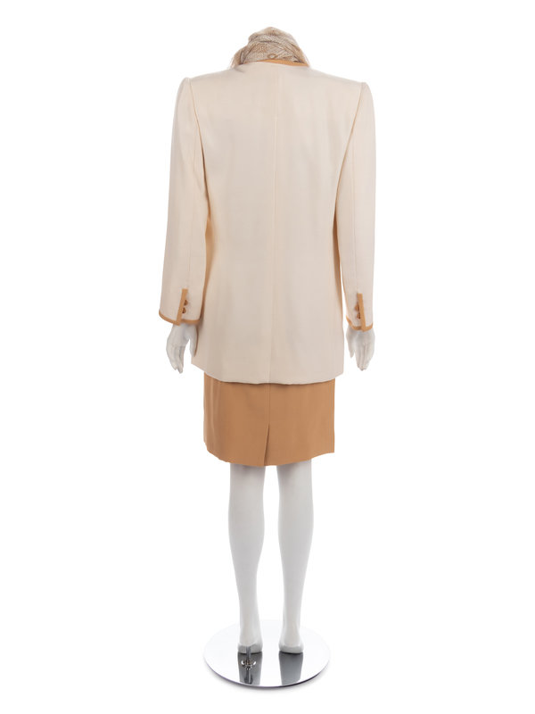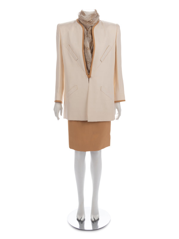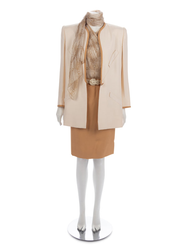 This ensemble includes a Cream silk slub suit jacket trimmed in camel, a camel and cream printed dobby chiffon blouse with matching scarf, camel silk slub skirt, and off white leather belt.