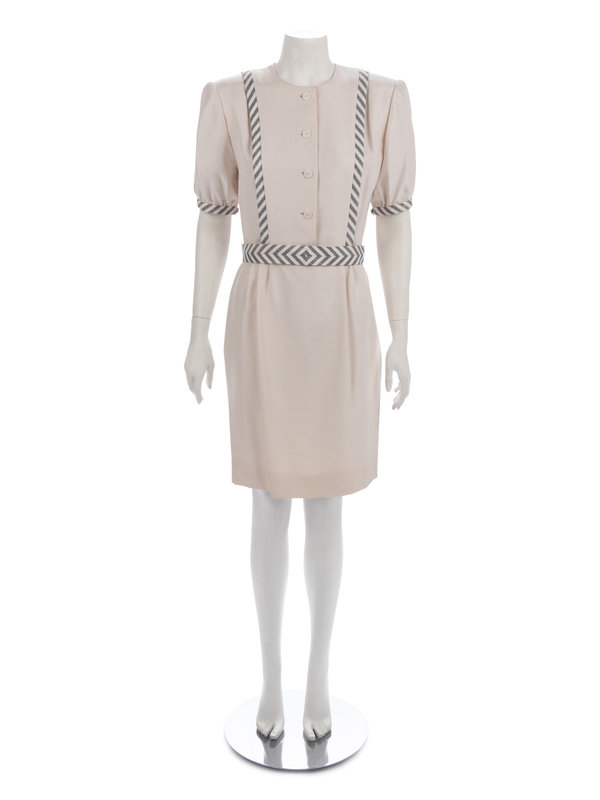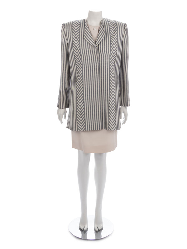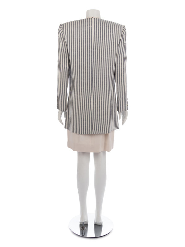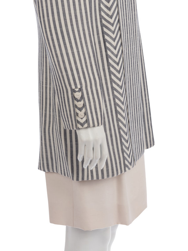 White with blue stripe cotton/silk blend jacket with sewn chevron detail and front button closure. Paired with an off-white silk shantung dress with blue and white stripe detail, puff short sleeves, center back zipper closure, and striped fabric belt.