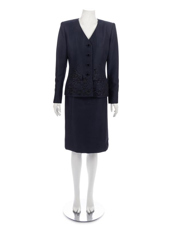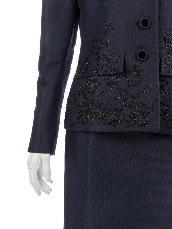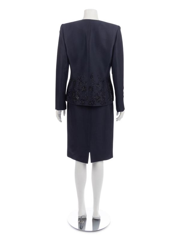 Dark blue acetate/polyester/wool blend dobby skirt suit with a clean neckline jacket with black maple leaf beaded embellishment on the hemline and paired with a straight fit skirt in same fabric.