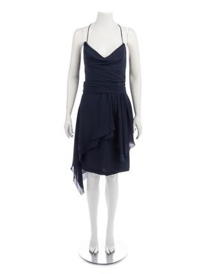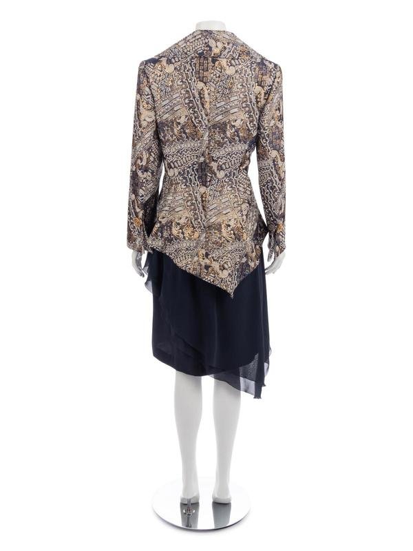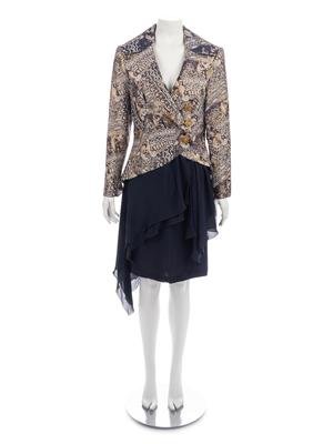 Blue, gold, and white polyester/silk/wool blend jacquard jacket with exaggerated lapels, flared sleeves, and gold-tone metal button and snap front left closure paired with dark blue silk crepe spaghetti strap dress with gathered belt, and asymmetrical skirt drape.