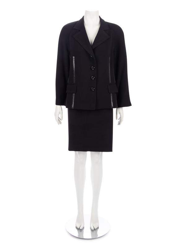 Black wool suit jacket with patent leather details, fish-mouth lapel, front waist flap pockets, and center front button closure; paired with matching straight fit skirt.