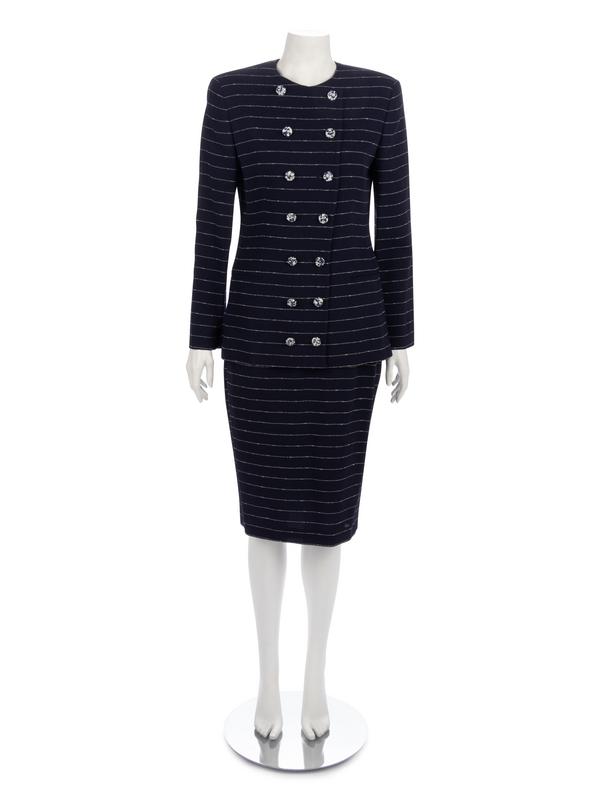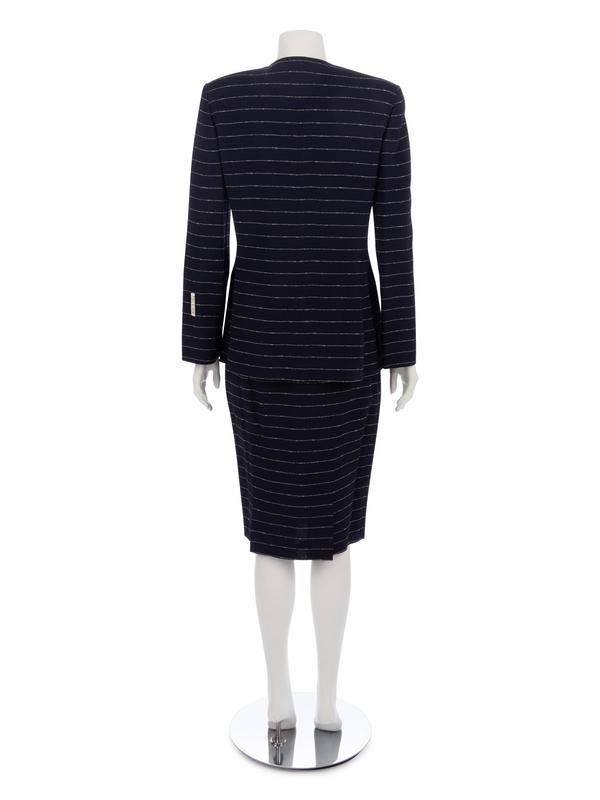 Dark blue with white stripe wool double breast suit jacket with front hip welt pockets and front composite resin button closure; paired with matching straight fit skirt.