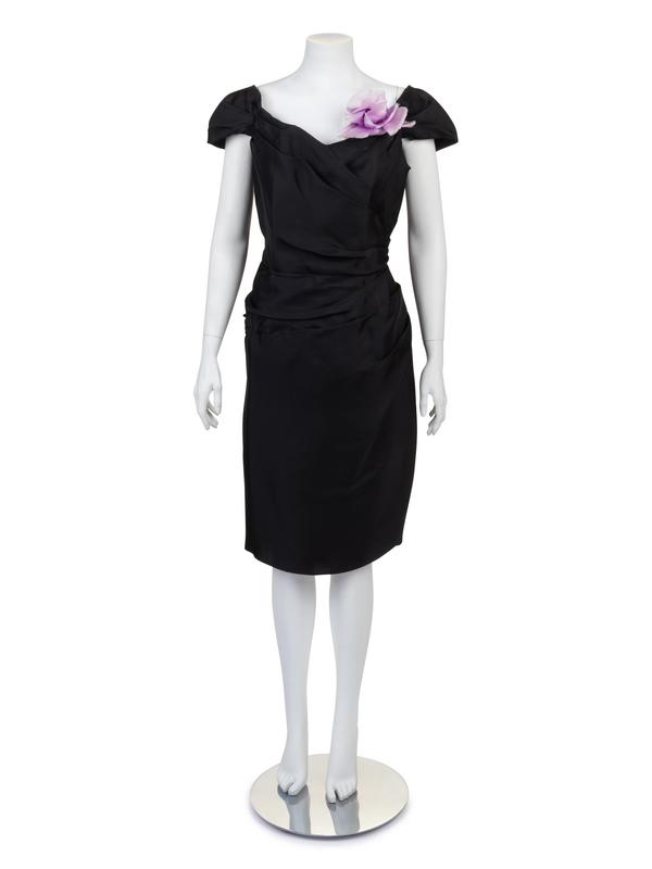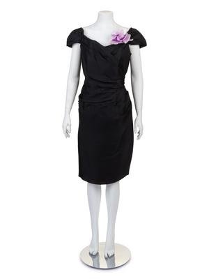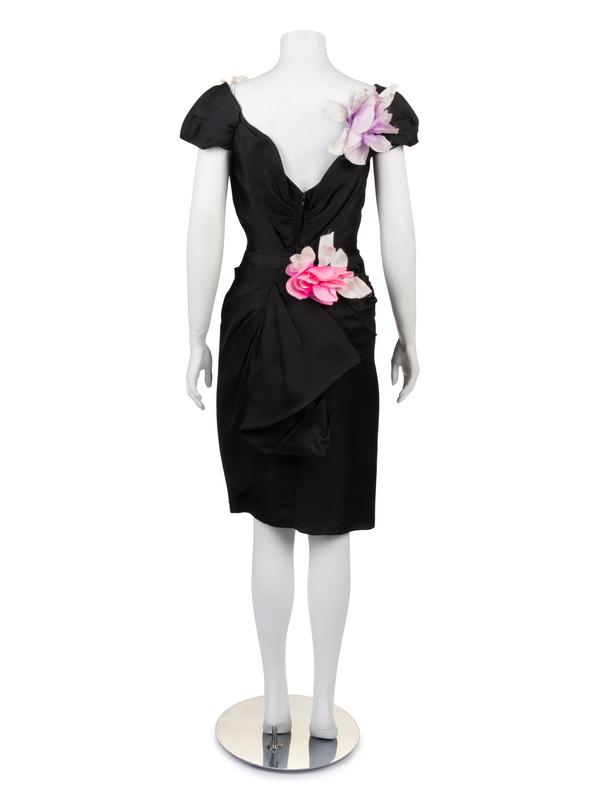 Black silk dress with fitted silhouette gathered into a peplum over the left back hip. With five silk flowers (1 pink, 1 black, 1 cream color and 2 light purple) for the drapes at the back.