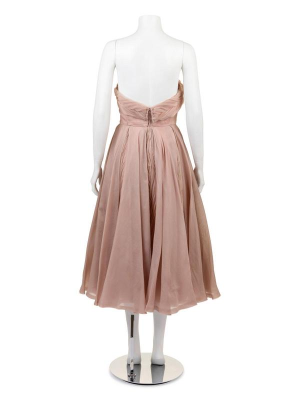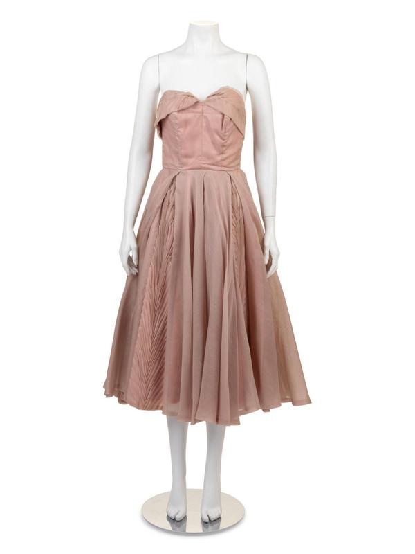 A pink/gray sheer strapless dress with a boned bodice and full skirt made of panels pleated and gathered sheer fabric.