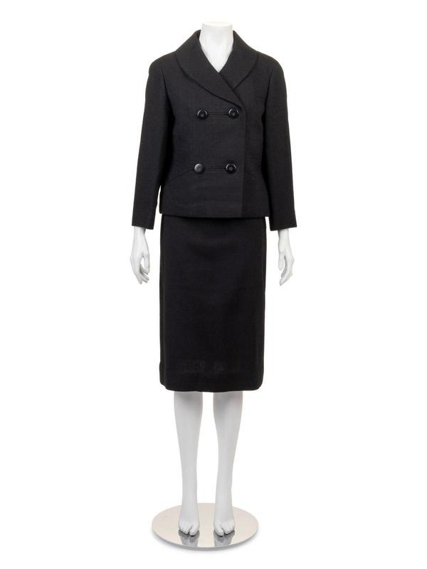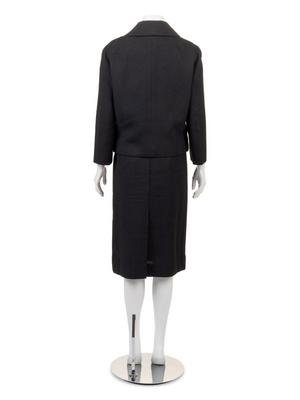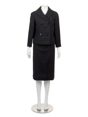 Black silk crepe skirt suit. Jacket has a curved lapel, long sleeves and a double-breasted button closure. Straight skirt is gathered into a thin waistband with a side seam zip closure. All main seams are sewn by machine while the lining and finishing stitches are sewn by hand.
