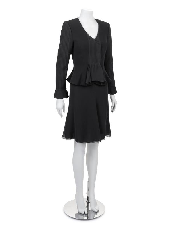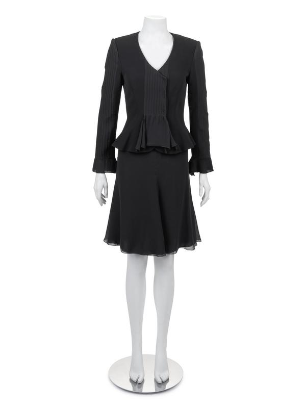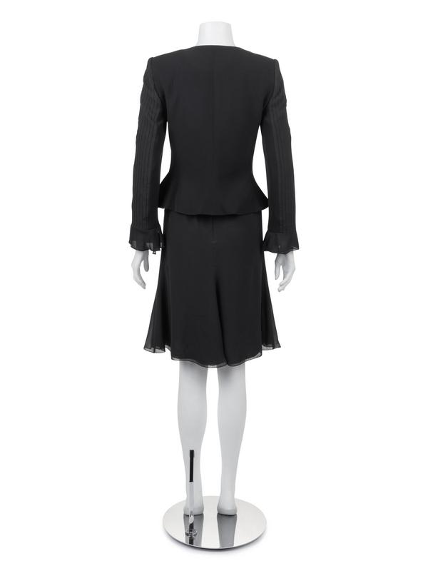 Black wool jacket with scoop neck, pin-tuck pleated crepe detail along sleeves and center front, finished with crepe flounces at waist and sleeve cuffs; paired with crepe flared skirt.