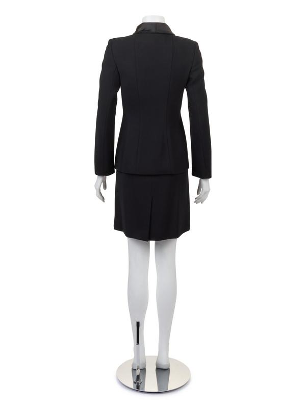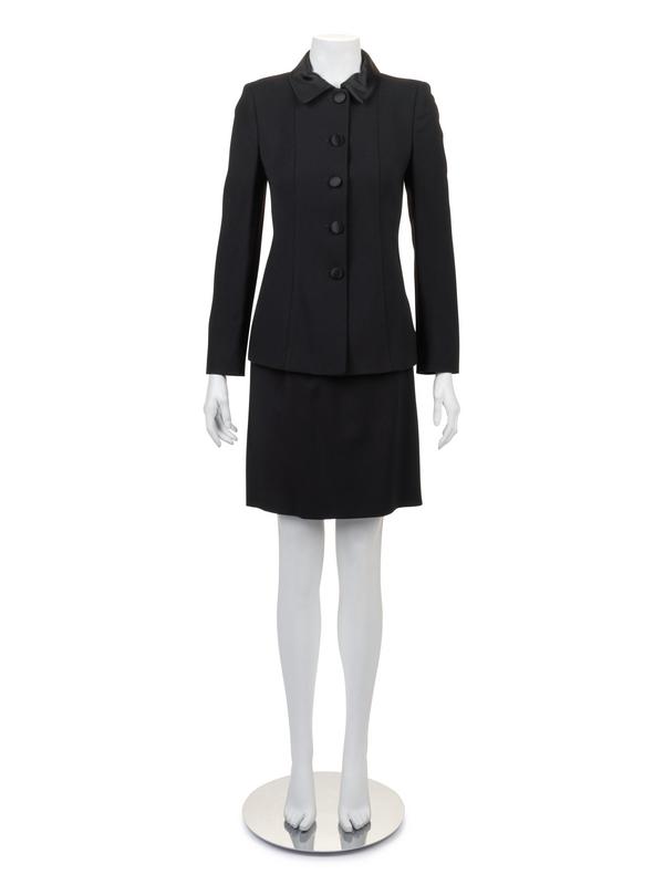 Black wool crepe suit jacket with black satin faced roll collar and satin covered buttons, paired with matching black crepe straight skirt.