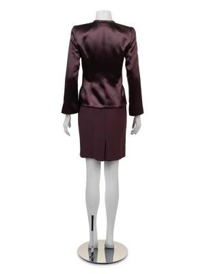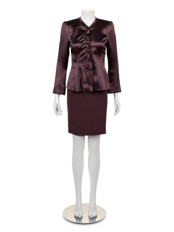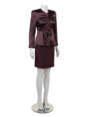Dark Mauve satin suit jacket with scoop neck and ruffled center front hidden button closure; paired with a dark mauve wool crepe straight skirt.