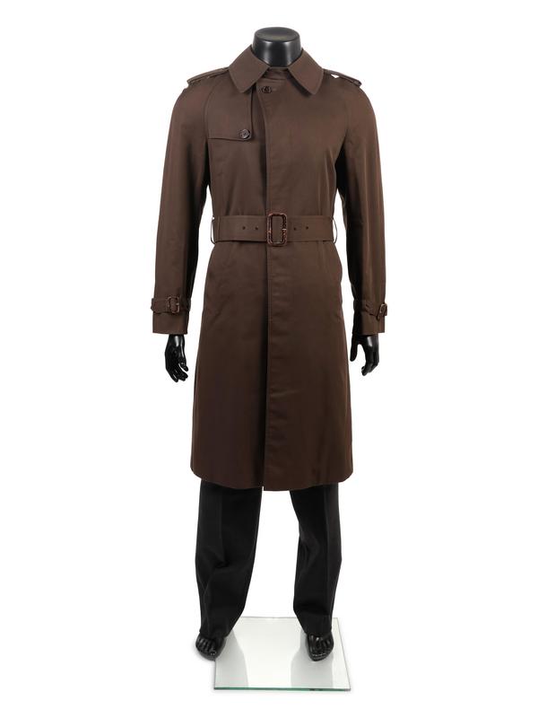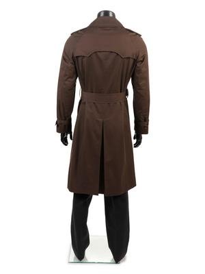 Brown cotton/polyester blend men's trench coat with raglan sleeves with epaulets, belted sleeve cuffs, and welted front hip pockets.