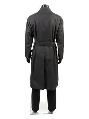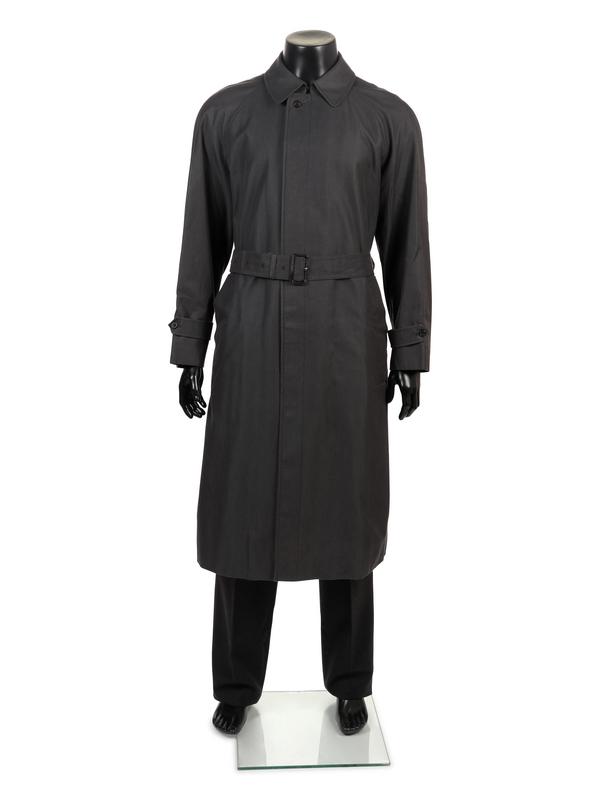 Gray cotton men's trench coat with raglan sleeves, belted sleeve cuffs, waist belt, and dual entry welted front hip pockets.