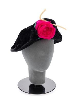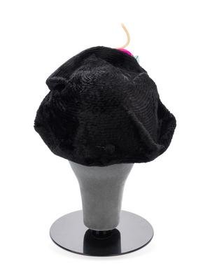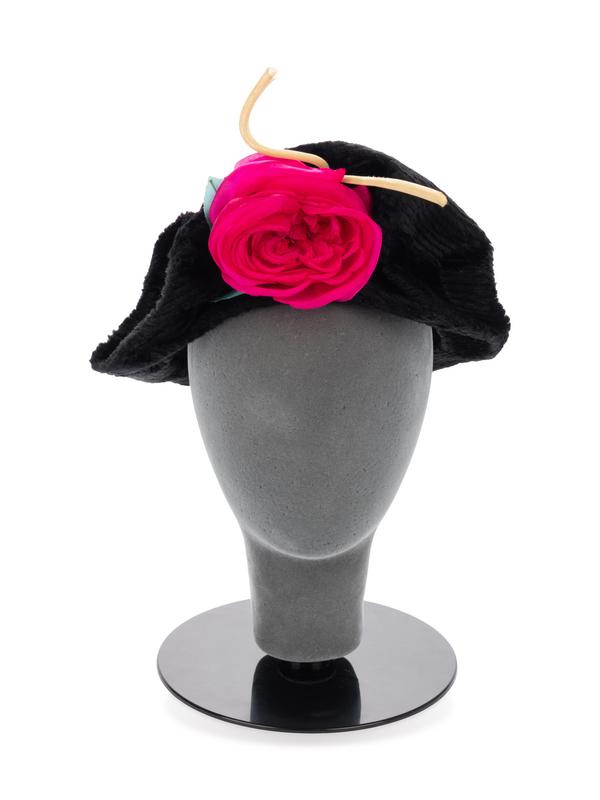 Black chenille hat with fuchsia fabric flower on front.