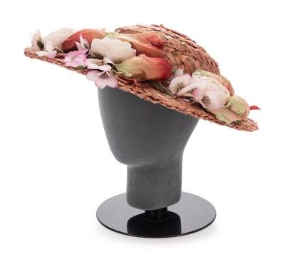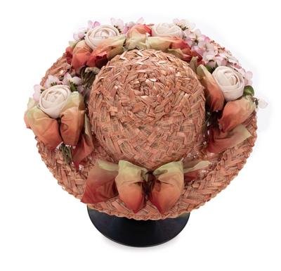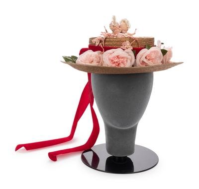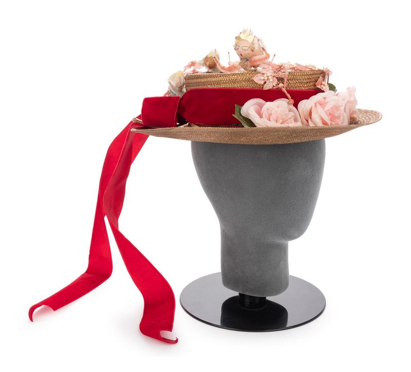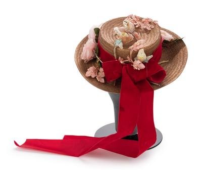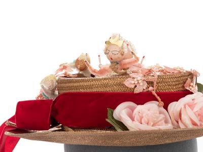 Gold painted straw hat trimmed in red velvet ribbon, pink fabric flowers, gold-tone cord, and pipe-cleaner and paper figures.