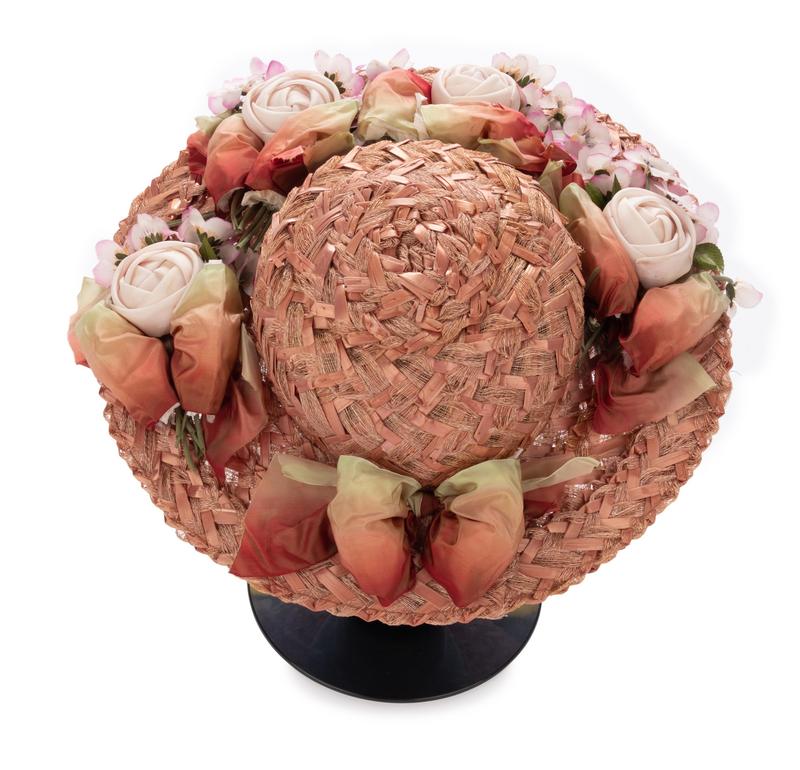Pink braided straw hat with ombre taffeta ribbon trim and fabric flowers.