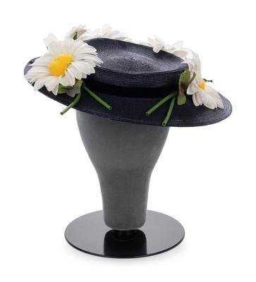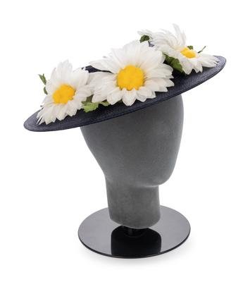 Dark blue straw flat hat with blue velvet ribbon and white fabric daisy flowers on brim.
