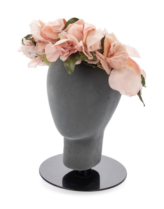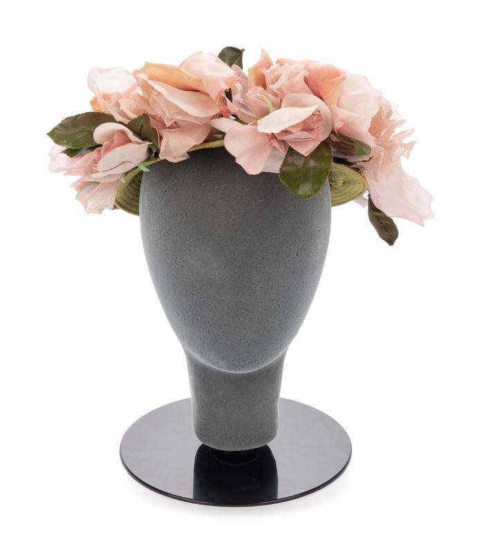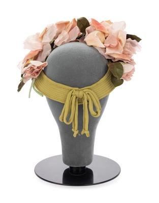 Green silk shaped knit headpiece with cord and bow detail, and pink fabric flowers.