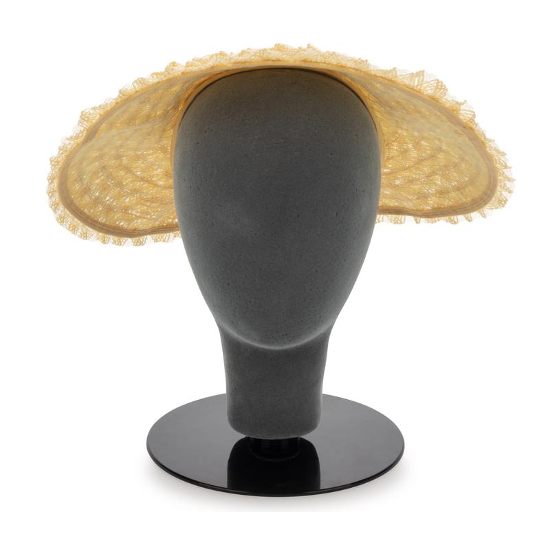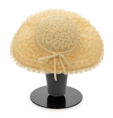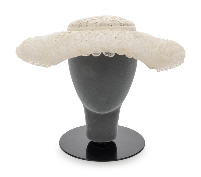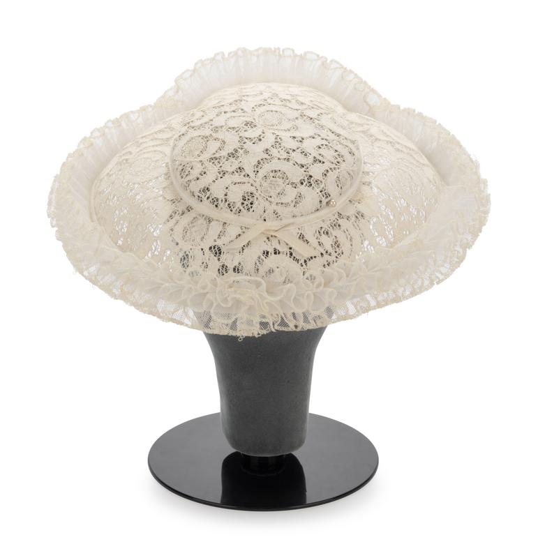 White lace hat with ruffled synthetic horsehair braid and white velvet ribbon trimmed brim.