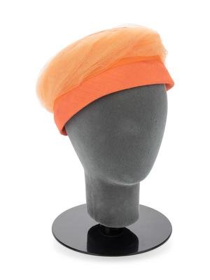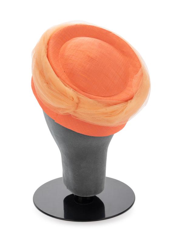 Melon orange shantung hat with orange net tulle wrapped crown.