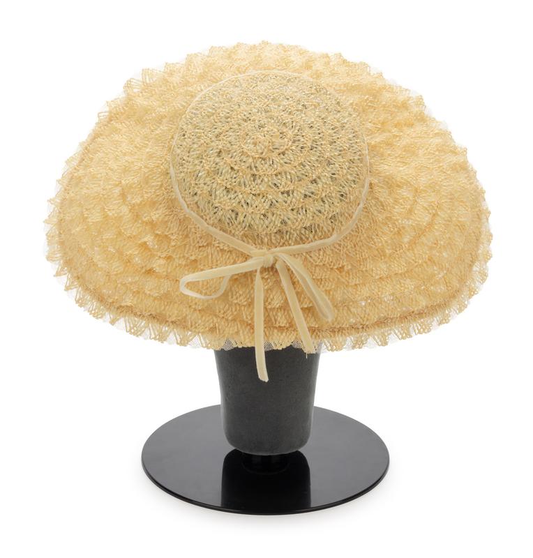 Light yellow straw and synthetic horsehair braid layered hat with cream velvet ribbon trim.
