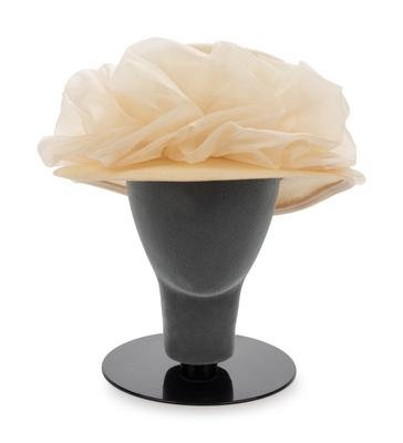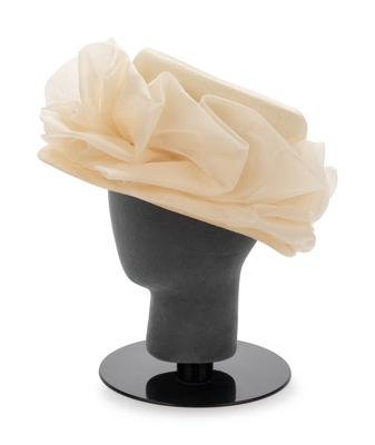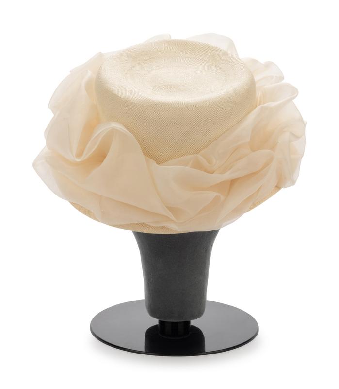 Cream straw hat trimmed in gathered cream organza.