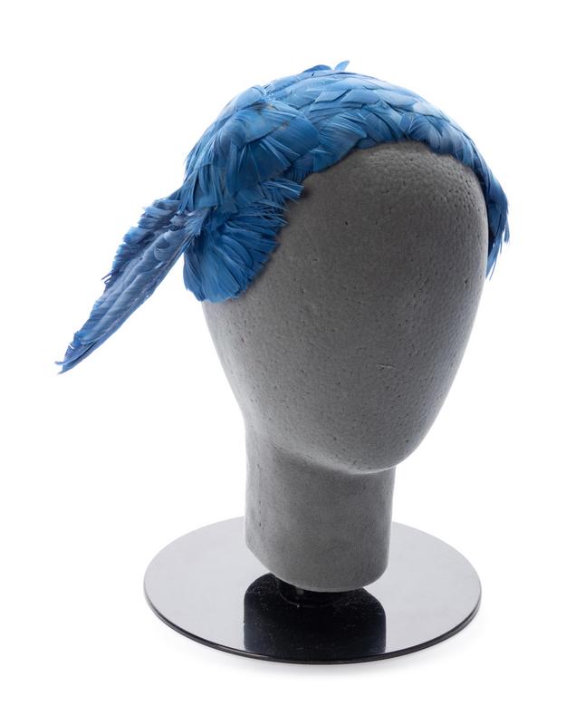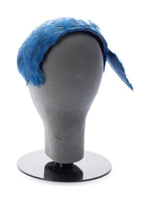 Blue feather hat with right side wing and trimmed with blue velvet.