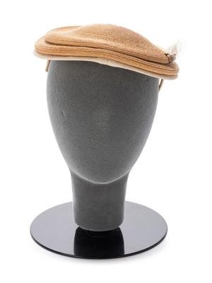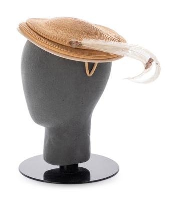 Natural straw hat with white ostrich feathers and brown velveteen flowers.