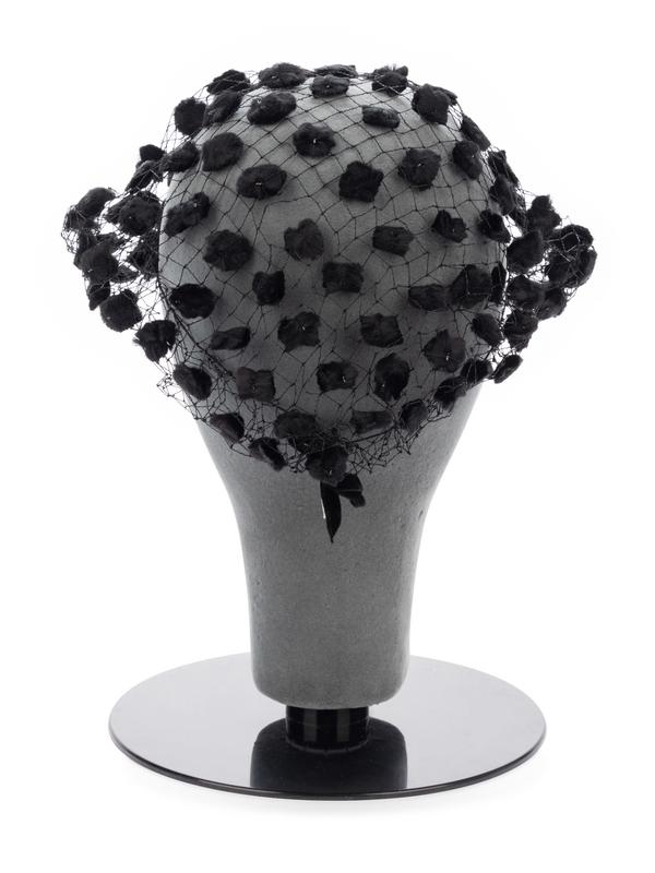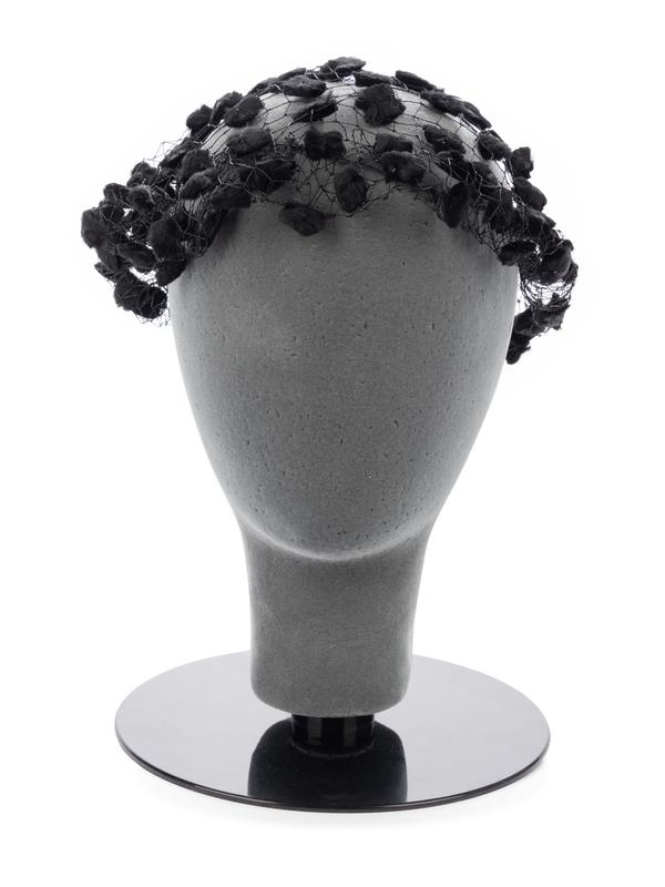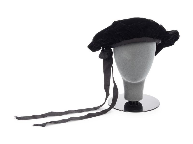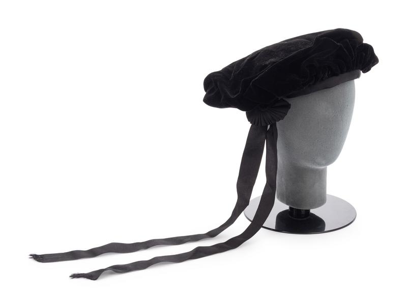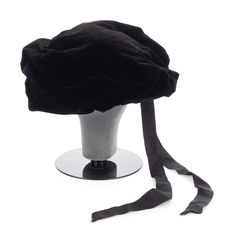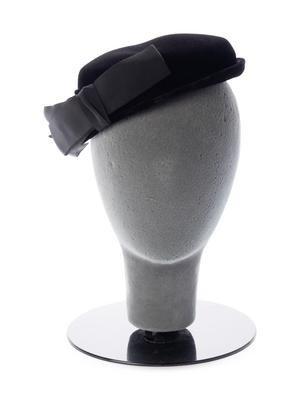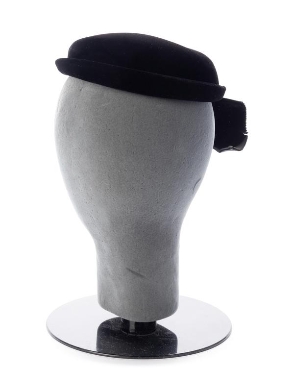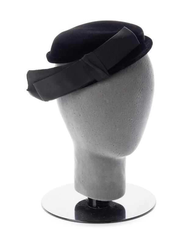 Black velvet hat with grosgrain ribbon bow.