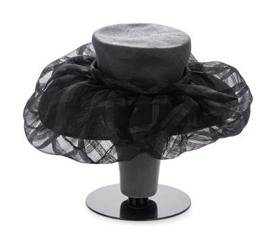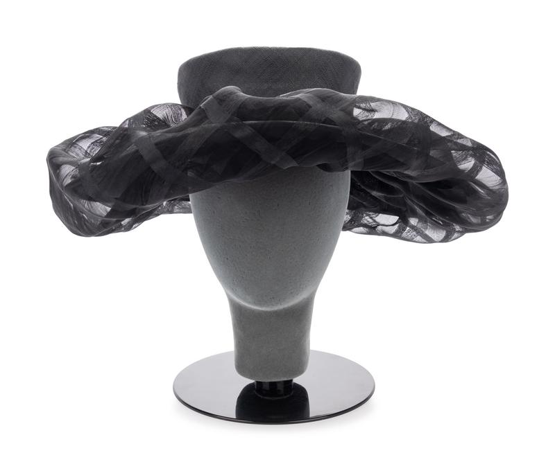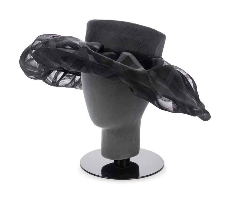 Black wide brim straw hat with black synthetic crinoline gathered into brim.