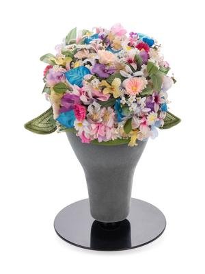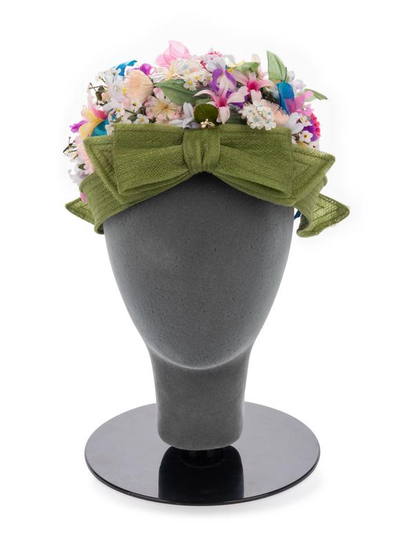 Green wired bow hat with fabric flowers on net.