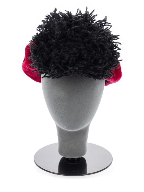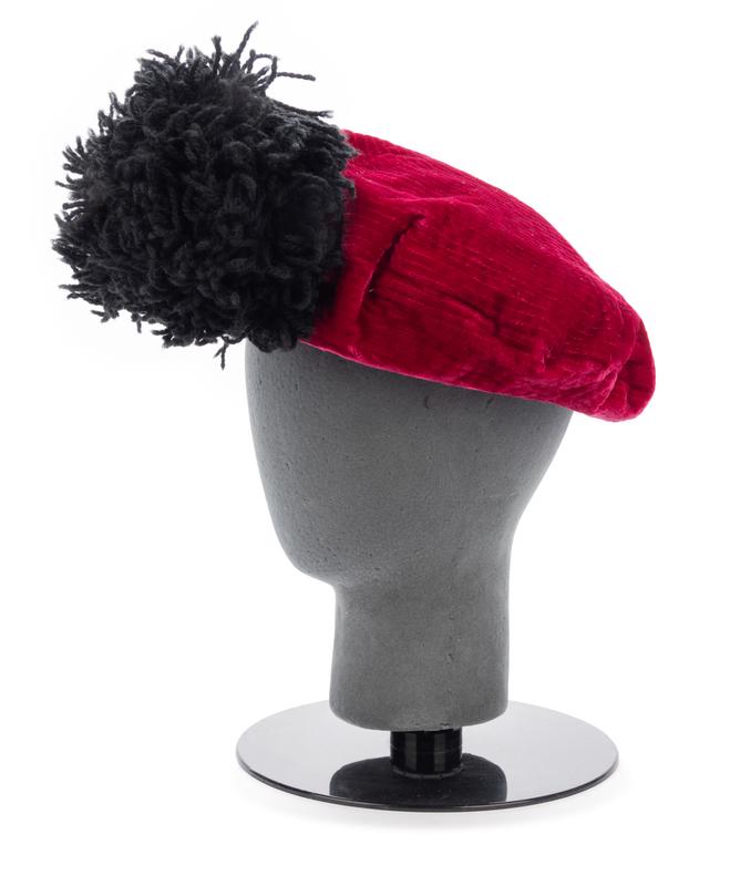 Red velvet quilted hat with large black textured yarn pom.