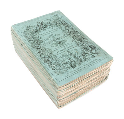 FIRST EDITION IN ORIGINAL MONTHLY PARTS, VIRTUALLY COMPLETE WITH ADVERTISEMENTS AND INSERTED SLIPS, with the "Copperfield Advertiser" in each part and all ads listed by Hatton & Cleaver, except: back wrappers differ in parts 1, 2, 8, and 19/20; with all front ads except lacking slip before plates parts 7 and 19/20, with a different slip part 10; lacking a few of the back ads parts 12, 18, and 19/20 (but with back ads present in each of those numbers). David Copperfield, written at the midpoint of Dickens' career, draws from the author's own life. The novel is scarce in parts. As Eckel notes, the printing was comparatively small, the parts were "much read and roughly handled," and "fine, clean and unrepaired copies [were] difficult to procure" even in 1932. Hatton & Cleaver pp.253-272; Sadleir 686; Yale/Gimbel A121. A FINE COPY.
