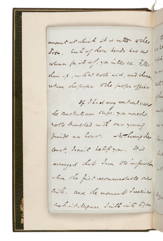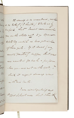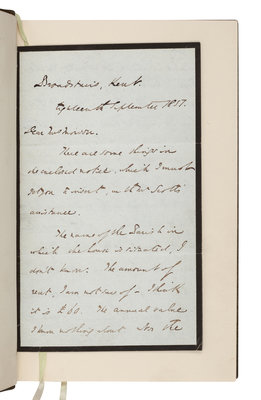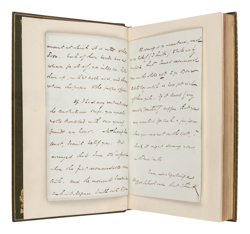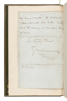 FIRST EDITION, FIRST ISSUE, with p. 213 misnumbered as p. 113. VERY FINE. [Tipped in:] An AUTOGRAPH LETTER SIGNED ("Charles Dickens"), to a Mrs. "Manson[?]", Broadstairs, Kent, September 18, 1857. 4 pages, octavo, on light blue, mourning stationery. Dickens writes with a small piece of business possibly with regard to his All the Year Round magazine, and then continues in response to a letter earlier received. "There are some things in the enclosed notice, which I must get you to insert without Scott's assistance ... If I had any control over the Australian ships you would not be troubled with our young friends an hour. Not having the least, I can't help you. It is arranged that I am to be informed when the first recommendable one sails. And the moment I receive such intelligence I will write to you. I would recommend you on the whole not to go ... until we have got rid of these girls," who, it seems, they are looking to place in a boarding school.
