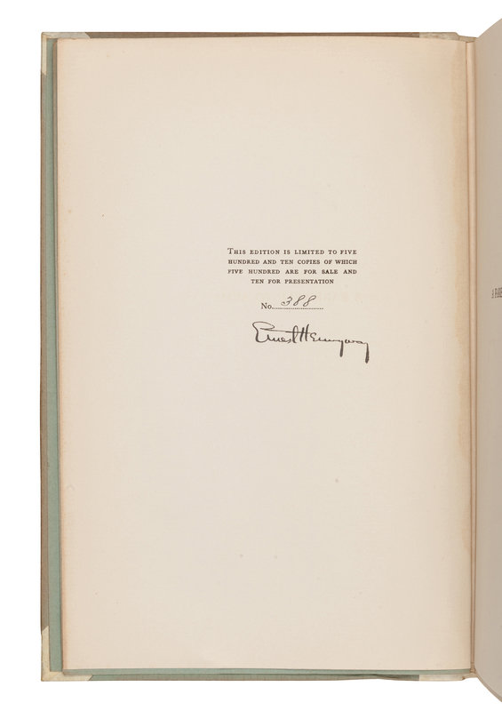 FIRST EDITION, LIMITED ISSUE, number 388 of 510 copies SIGNED BY HEMINGWAY. The limited issue was issued simultaneously with the first trade issue. Connolly, The Modern Movement 60 ("his first full-length novel and probably his best"); Hanneman A8b.