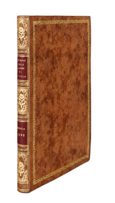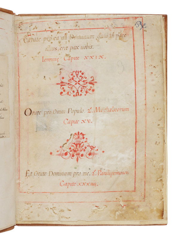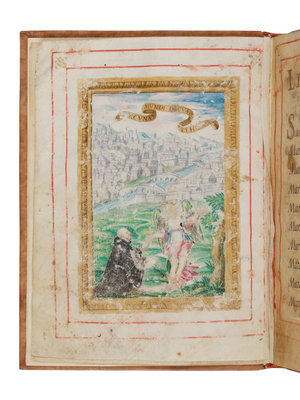 48 leaves, 192 x 140 mm, on vellum. Written in dark brown & red ink in various hands. Double-ruled borders in red throughout. With red penwork decorations between quotations. Dedication leaf to “Alle molto [Re]everende et Deuote Sig[no]re Le Reverende Madri di S. Giulia di Brescia” with text below in a cursive hand (with text & decoration rubbed away & with some pigment transfer to facing page). Full-page miniature depicting kneeling patron or dedicatee, being bleswsed by an angel, with Latin motto above, 4 2-line initials, one in gold, the rest red, one leaf of music. Apparently incomplete, leaves rubbed with slight losses, some worming. Bound in modern leather gilt. Provenance: Conte Paolo Vimercati-Sozzi (1801-1883), Italian antiquary (engraved bookplate).