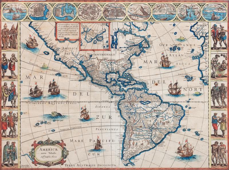 Engraved map with hand-coloring of the Americas, visible area 16 1/2 x 22 in. (420 x 555 mm). Decorative top border with vignette views of Havana, St. Domingo, Cartagena, Mexico, Cusco, Potosi, I. la Mocha, Rio Janeiro, and Olinder decorative side borders depicting natives from 10 areas, including Greenland, Virginia, Florida, Mexico, Peru and Brazil, galleons and sea monsters, decorative cartouche, inset of Greenland, Dutch text on verso.