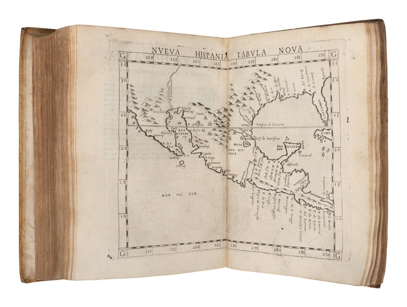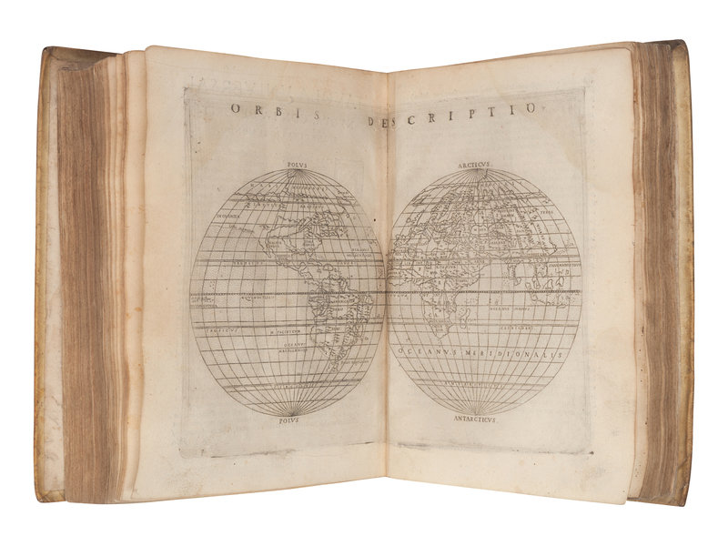 3 parts in one volume, 4to (217 x 162 mm). Woodcut device on titles, large woodcut of Ptolemy on recto of second leaf (repeated verso of fourth leaf), numerous in-text woodcut illustrations and diagrams, 65 double-page engraved maps. (Some light browning or staining, a few maps reinforced in gutter or with minor tears occasionally repaired.) Contemporary vellum, spine hand-lettered (soiled, text block detached). Provenance: Shelf label to foot of spine; a few early annotations to paste-down and text.