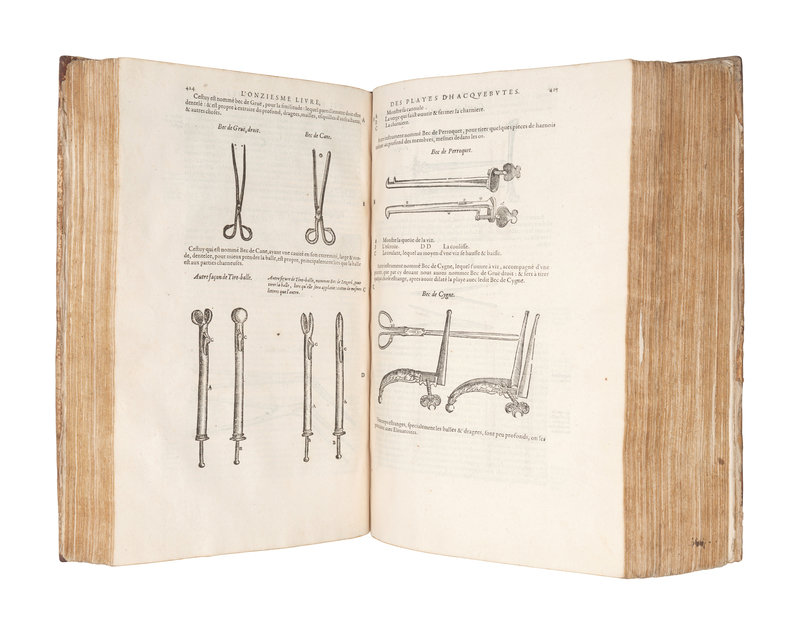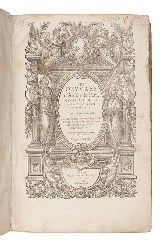[MEDICINE]. PARÉ, Ambroise (1510-1590). Les oeuvres ... Divisées en vingt neuf livres: Avec les figures & portraicts, tant de l'anatomie que des instruments de chirurgie, & de plusieurs monstres... Paris: Veufue Gabriel Buon, 1598.